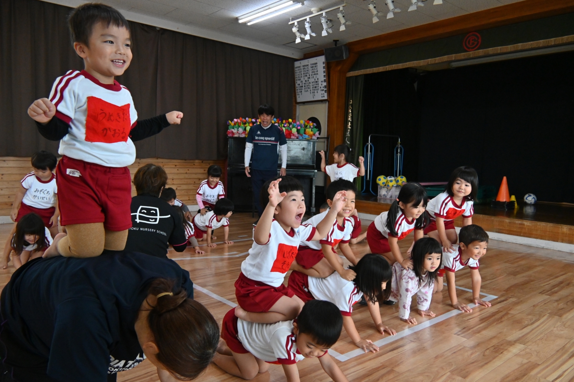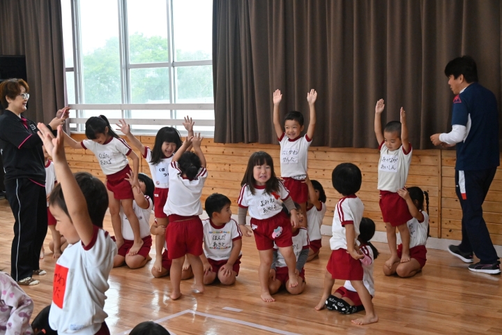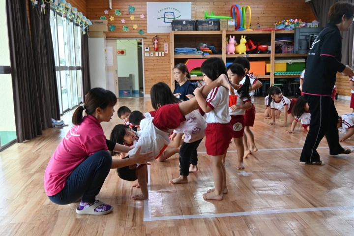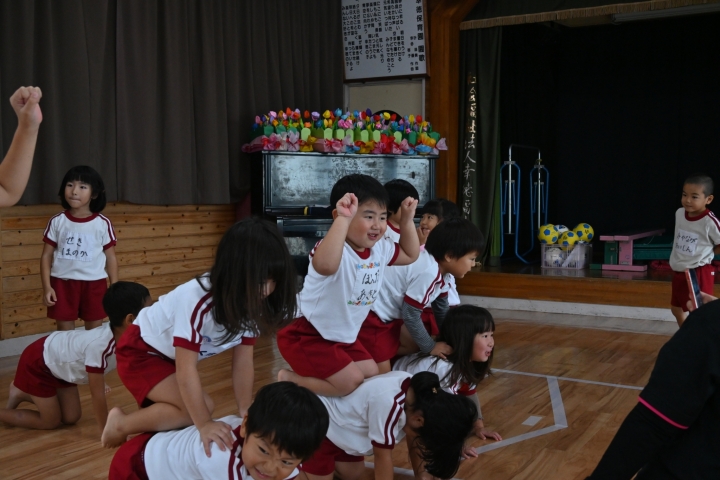 最近の子どもに不足している。集中力・聞く力・考える力・予測する力・体幹・止まる、マット、平均台、鉄棒、ボール等を使い多くのことを遊びの中で学んでいく、子どもたちは、簡単なことよりも難しい課題の方が楽しく、できたときの達成感を喜んでいました。